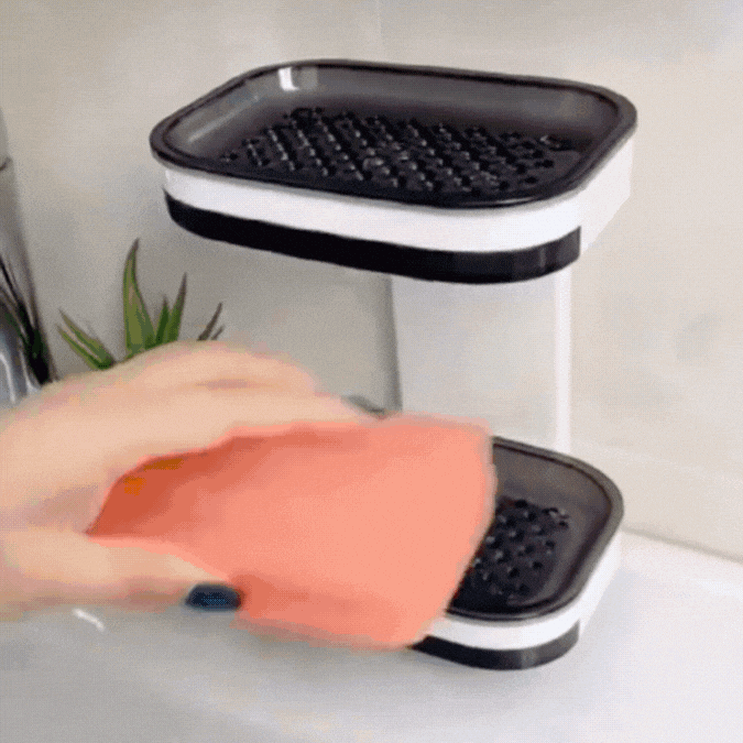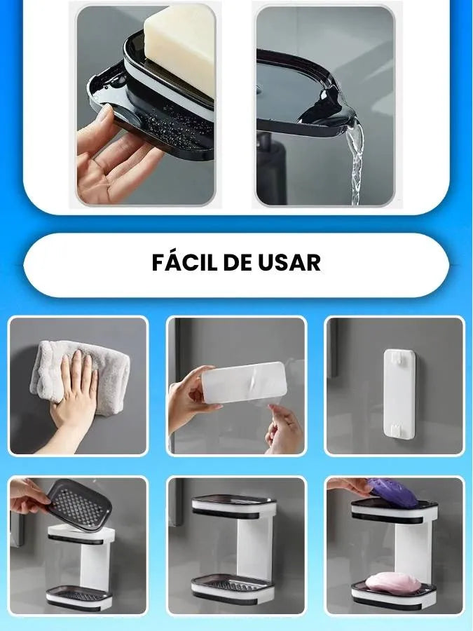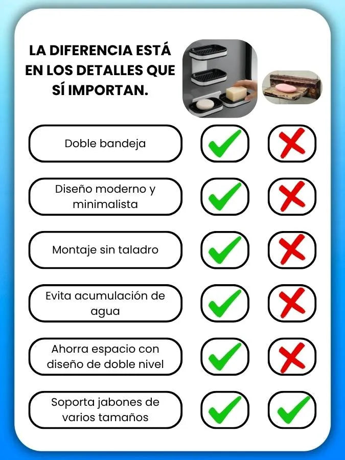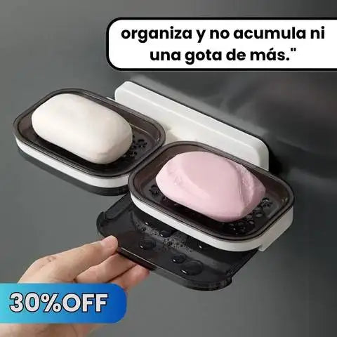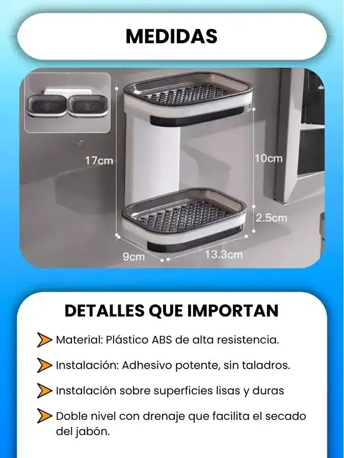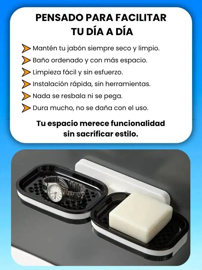 Sí, cuenta con un diseño tipo rejilla que permite que el agua escurra y evita la acumulación, manteniendo el jabón seco.