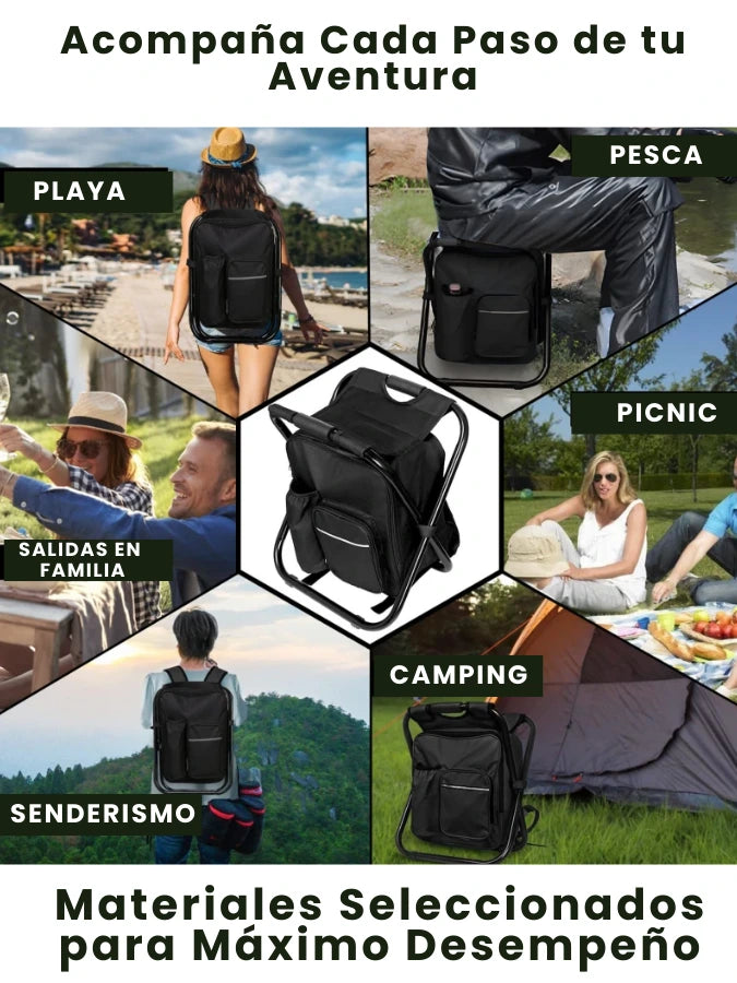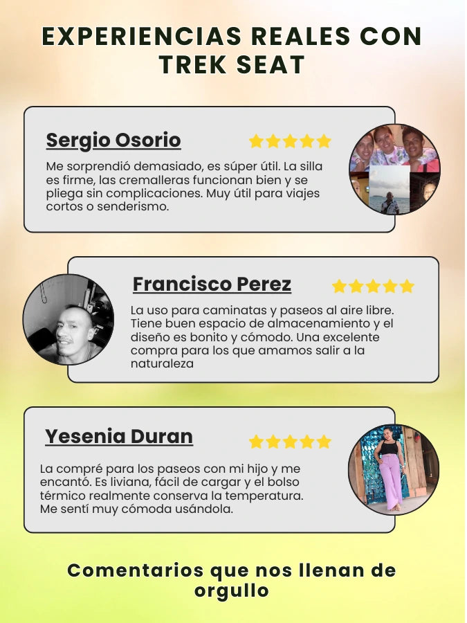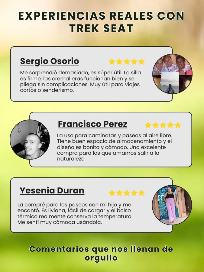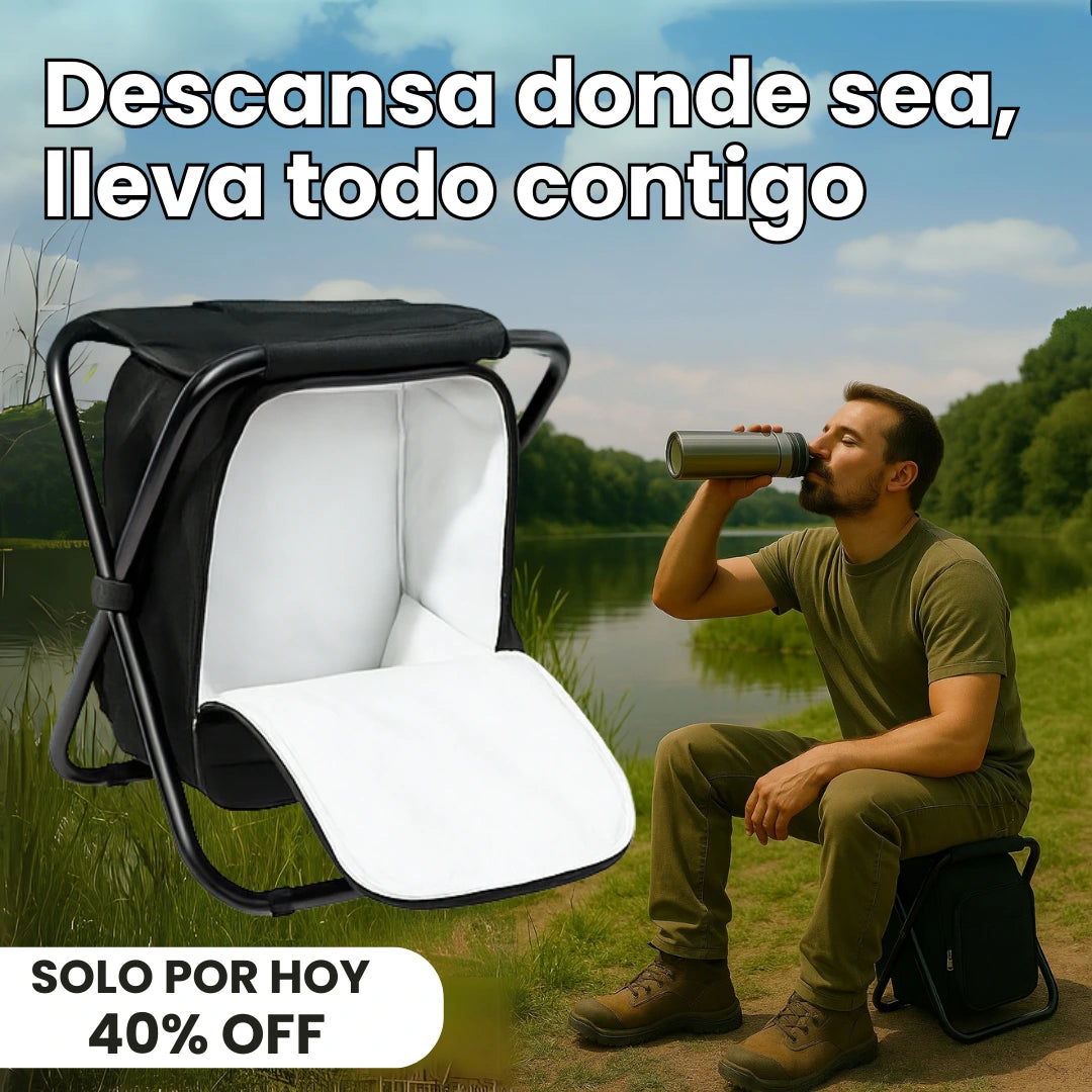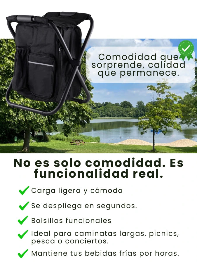 La Trek Seat soporta hasta 80 kg de manera segura. Está diseñada con una estructura metálica resistente ideal para descansar en cualquier superficie firme.